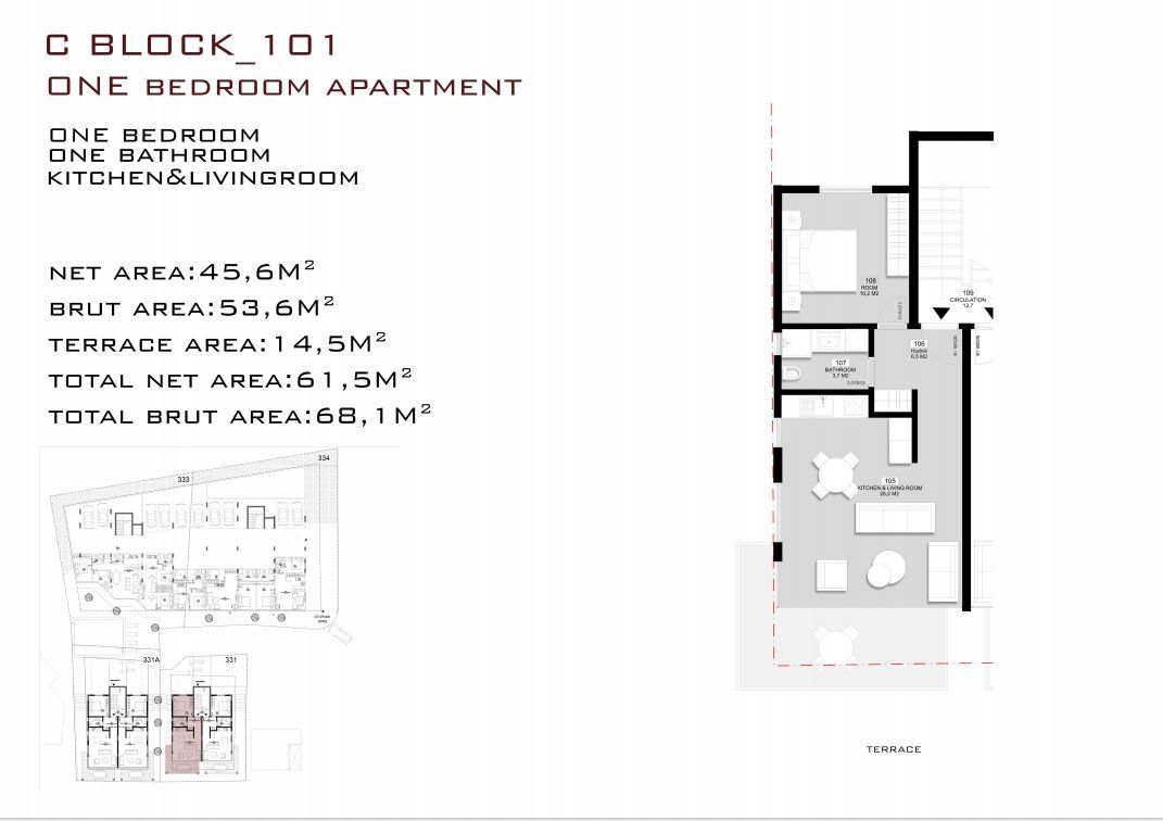 Das Apartment ist der Typ 1+1 und bietet einen modernen und funktionalen Layout mit einem großen Wohnzimmer, Küche, Schlafzimmer und integrierten Garderoben, die in die Preisbildung einfließen. Die Terrasse von 32,30 m² bietet zusätzliches Freiflächen für Genuss und Erholung.