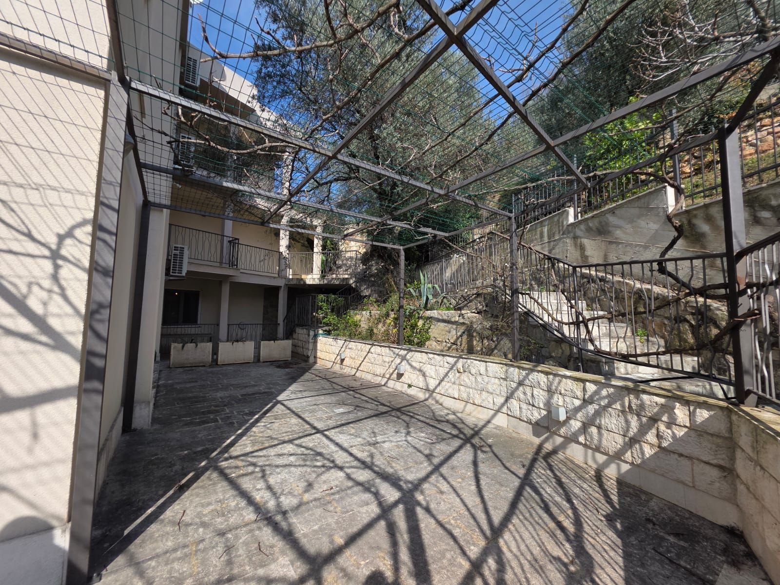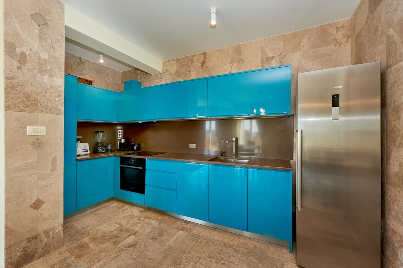 The structure of the apartment includes three bedrooms, two modern bathrooms with underfloor heating, two kitchens, two spacious living rooms and a refectory, as well as two large terraces with a view of the sea, one of which is equipped with a pergola for enjoying the outdoors. The apartment also includes a wine room, a utility room and a technical space.