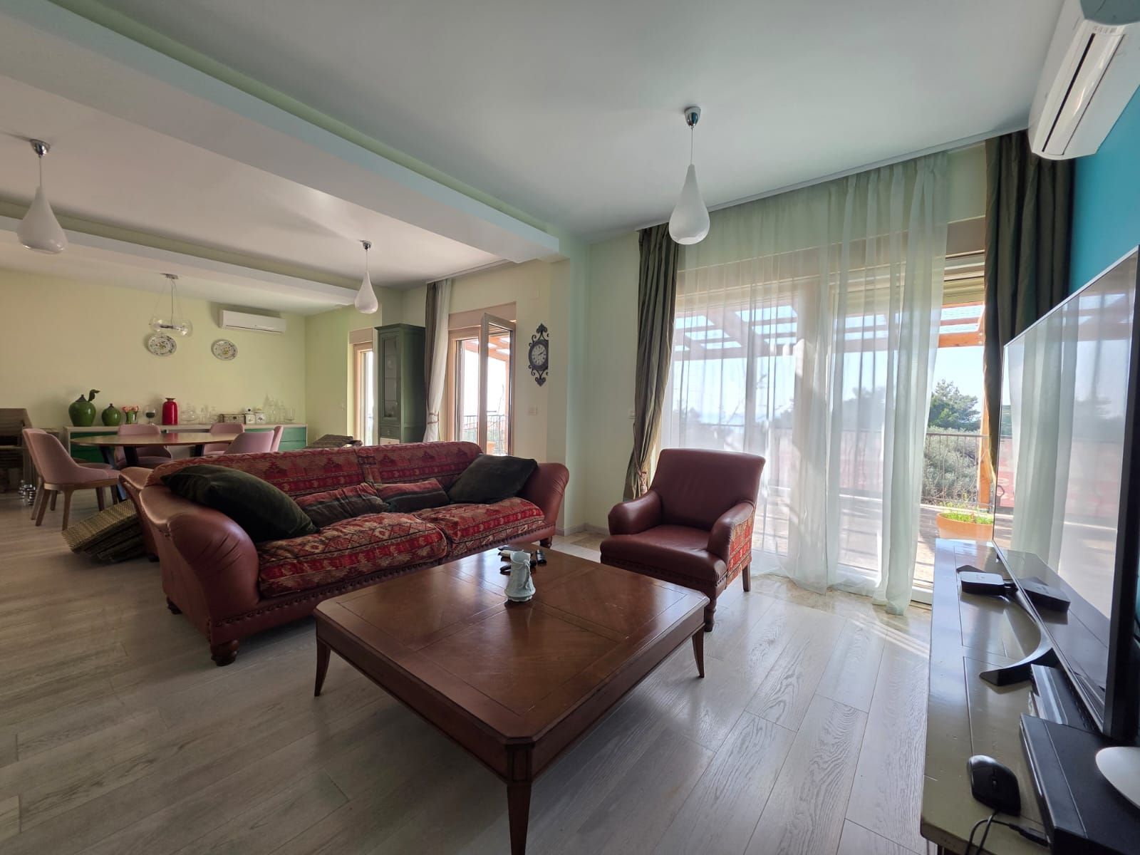 The total area of the apartment is 247 m², including an additional garage of 20 m² in the basement. The apartment is distributed over two floors and is fully furnished with quality new furniture and appliances, ready for moving in.