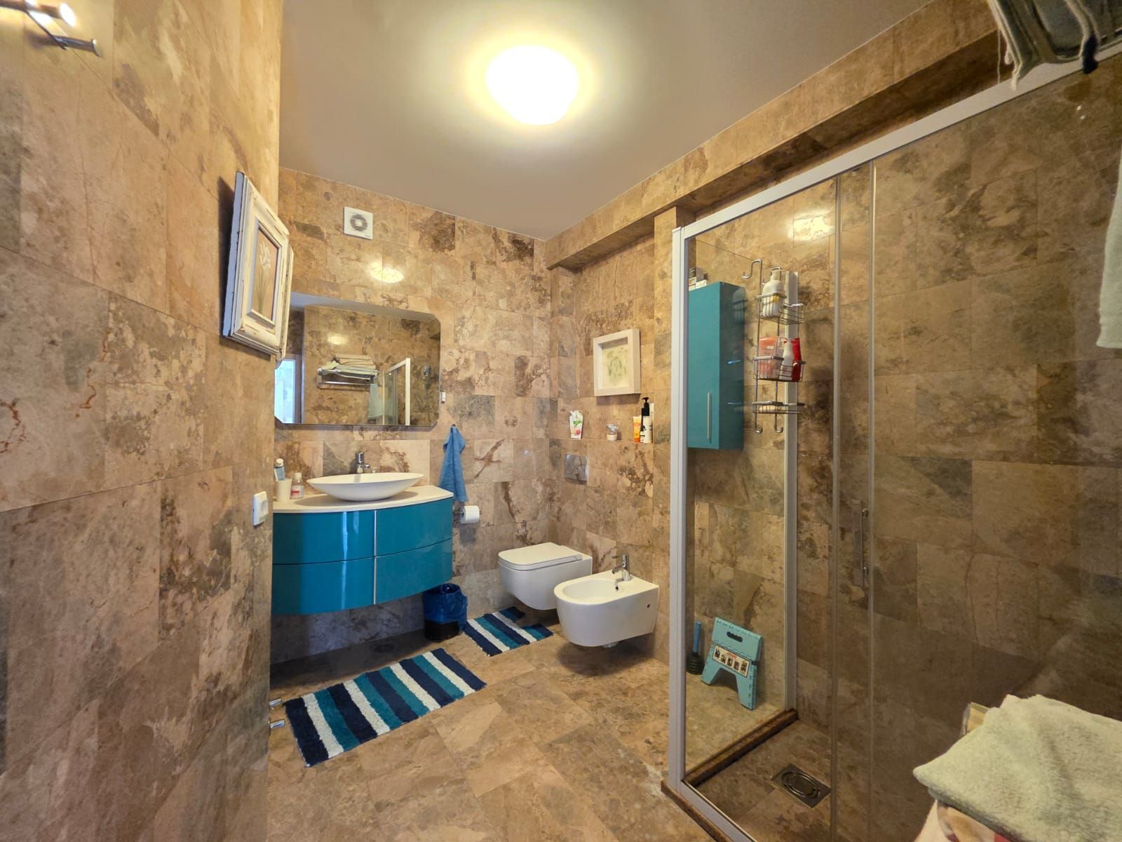 The total area of the apartment is 247 m², including an additional garage of 20 m² in the basement. The apartment is distributed over two floors and is fully furnished with quality new furniture and appliances, ready for moving in.