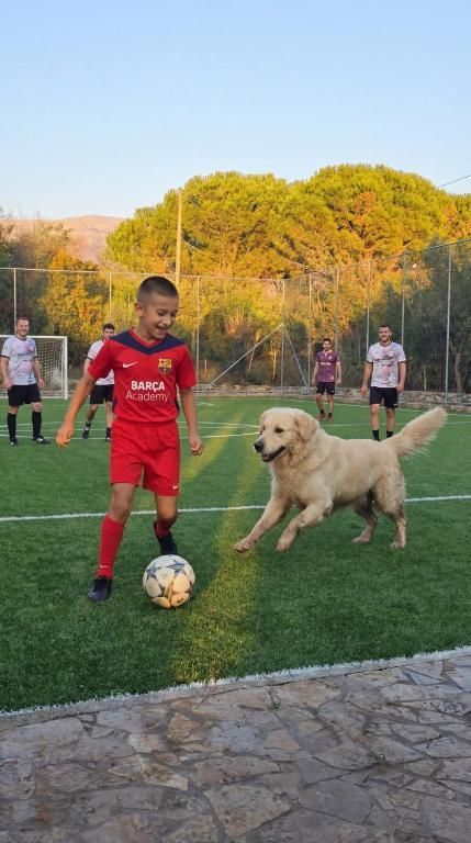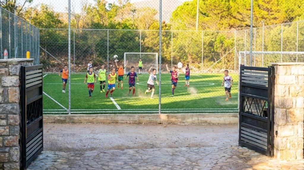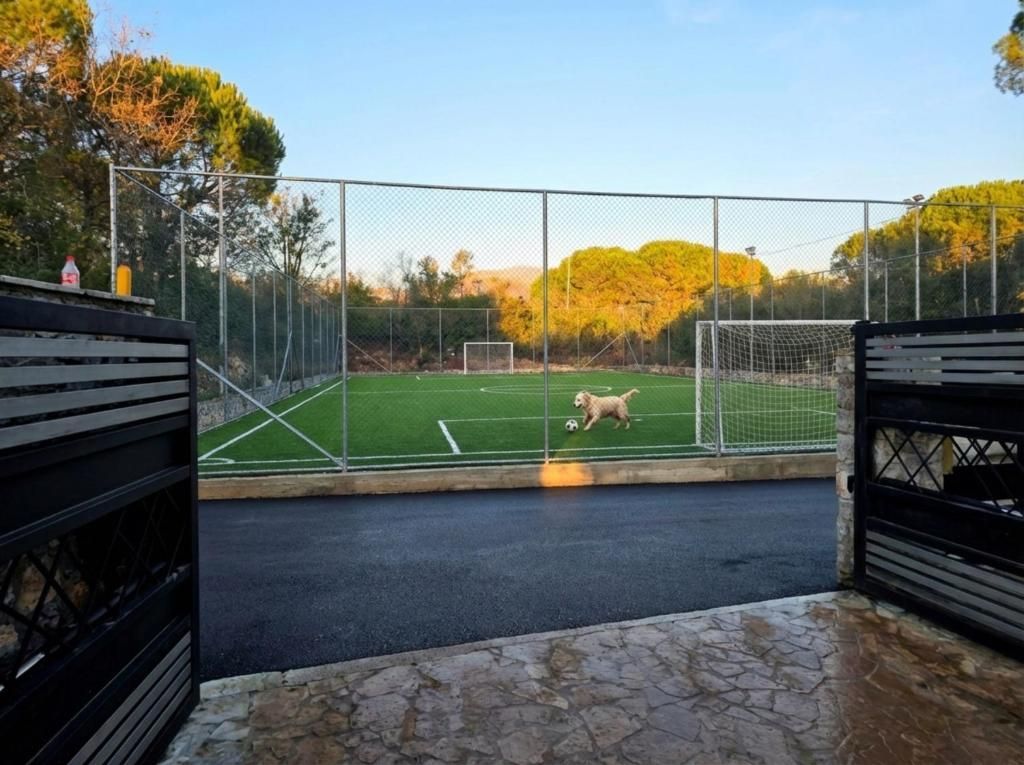 The front yard is spacious, enclosed by a beautiful stone fence, and full of greenery. It includes a large swimming pool, perfect for cooling off during hot summer days, as well as a barbecue area with an outdoor kitchen, ideal for preparing meals outdoors. The football field next to the villa further enhances this property, offering perfect entertainment and recreation for families and groups. Two parking spaces are available within the yard, adding extra convenience for guests.