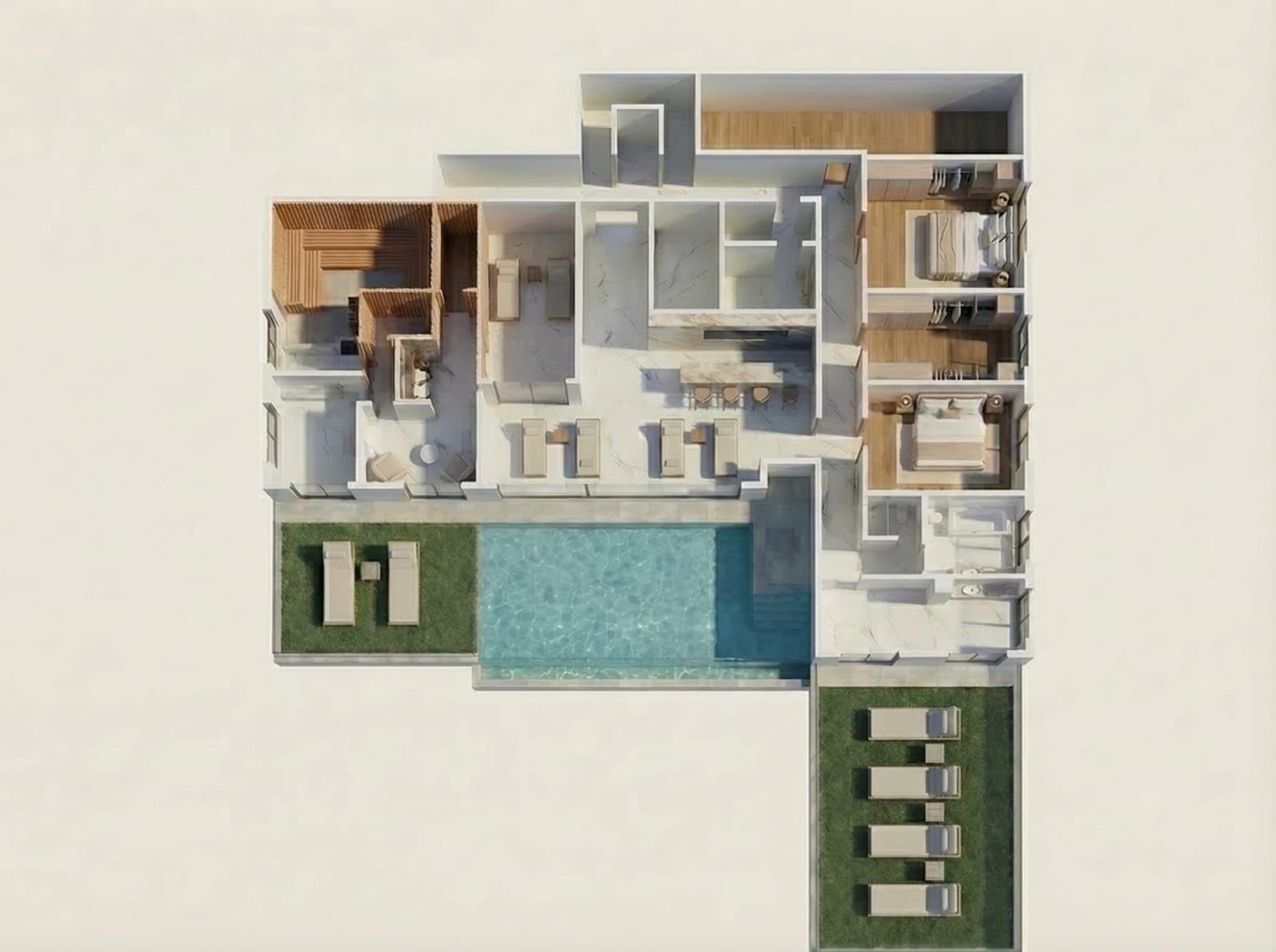 - Area: 64.76 m² + 51 m² green terrace with a private pool and recreation area.