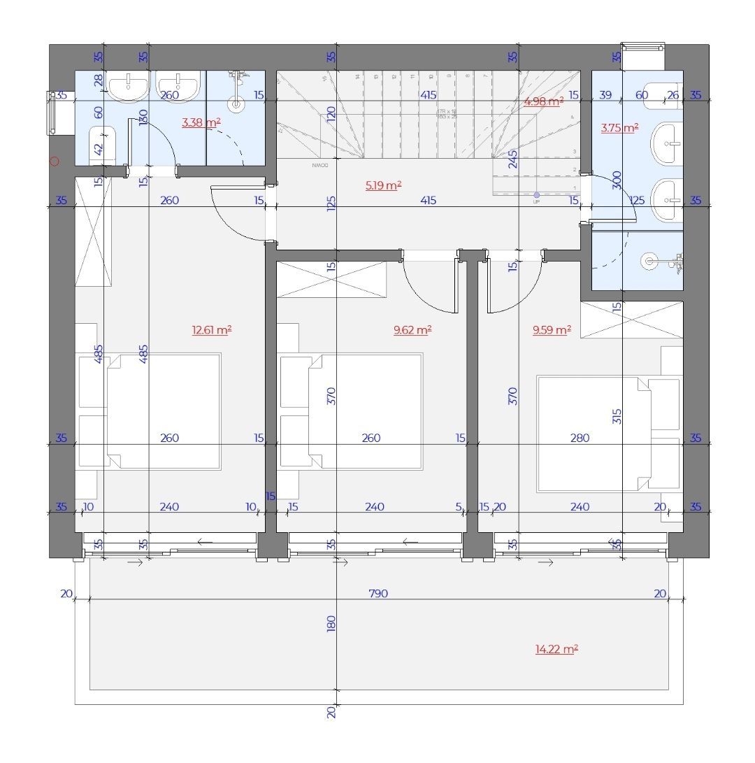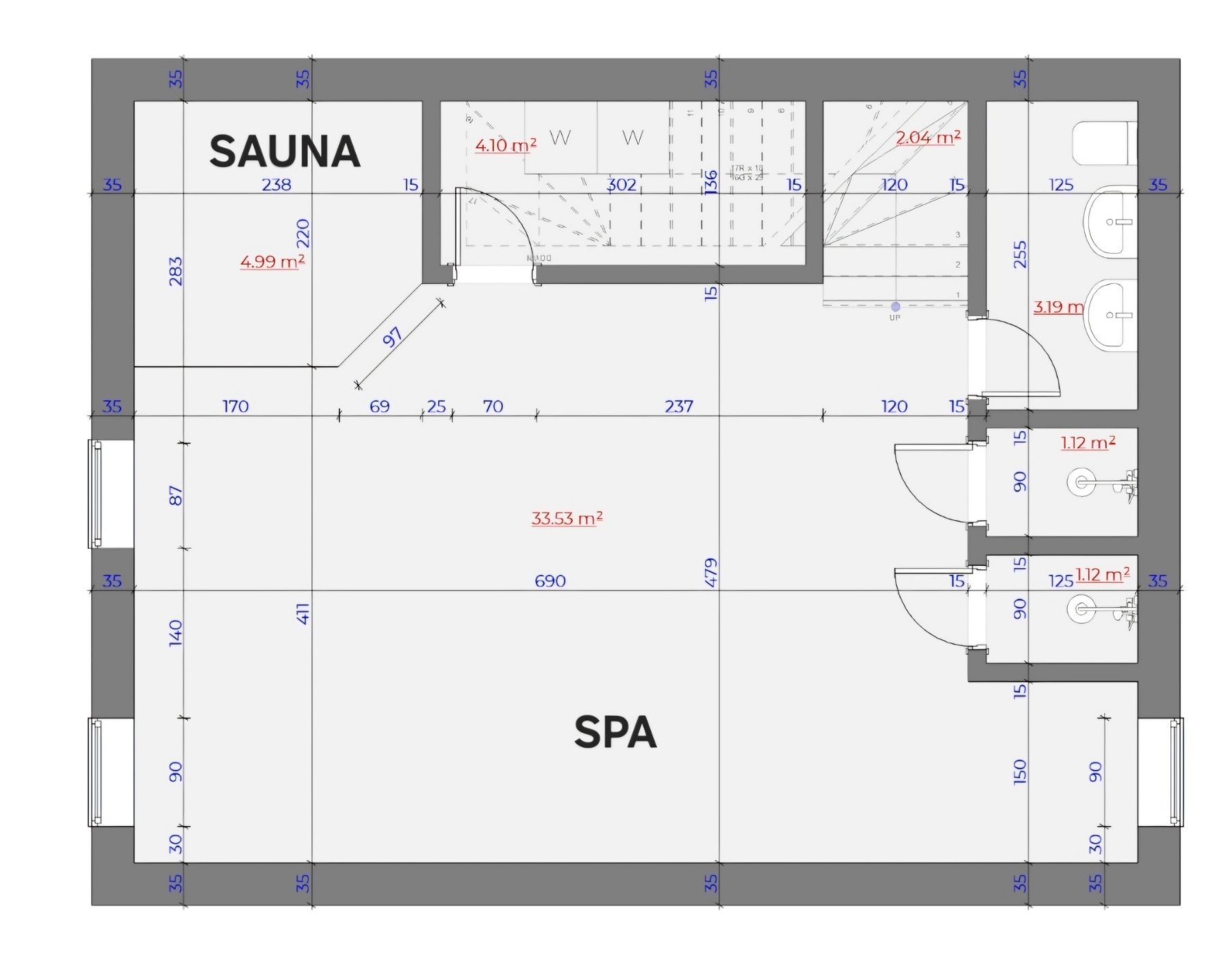 Villa "A" has an area of 212 m² and consists of a ground floor with a spacious living room, kitchen, dining area, guest toilet, and a large terrace. On the first floor, there are three bedrooms and two bathrooms, while the basement contains a spa center, technical rooms, and a storage room.