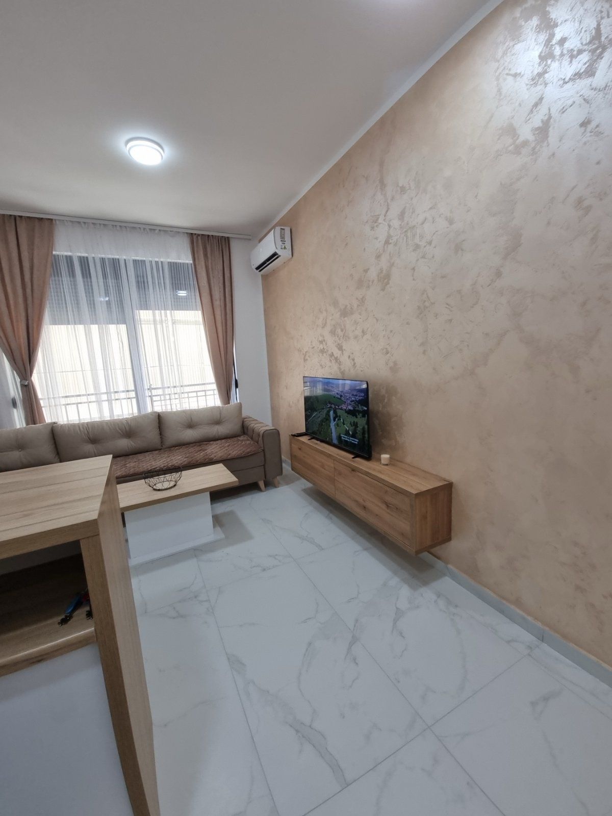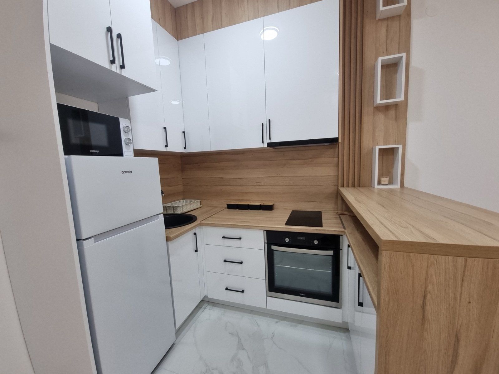 Sastoji se od svetlog dnevnog boravka sa kuhinjom i trpezarijom, kupatila i francuskog balkona.
