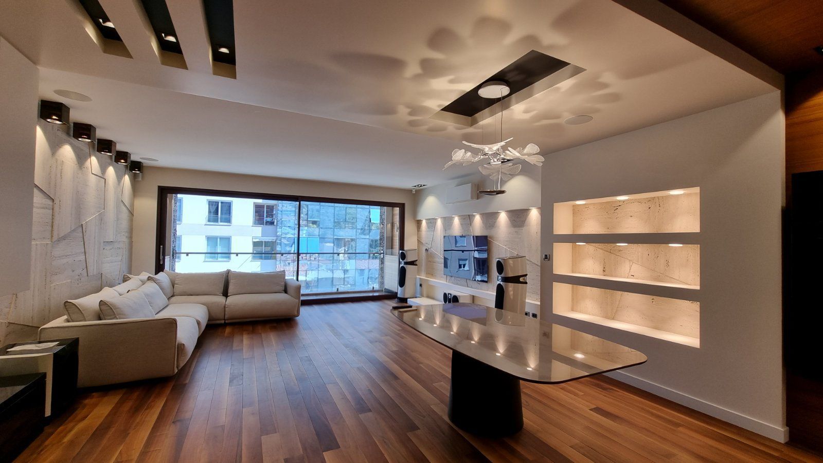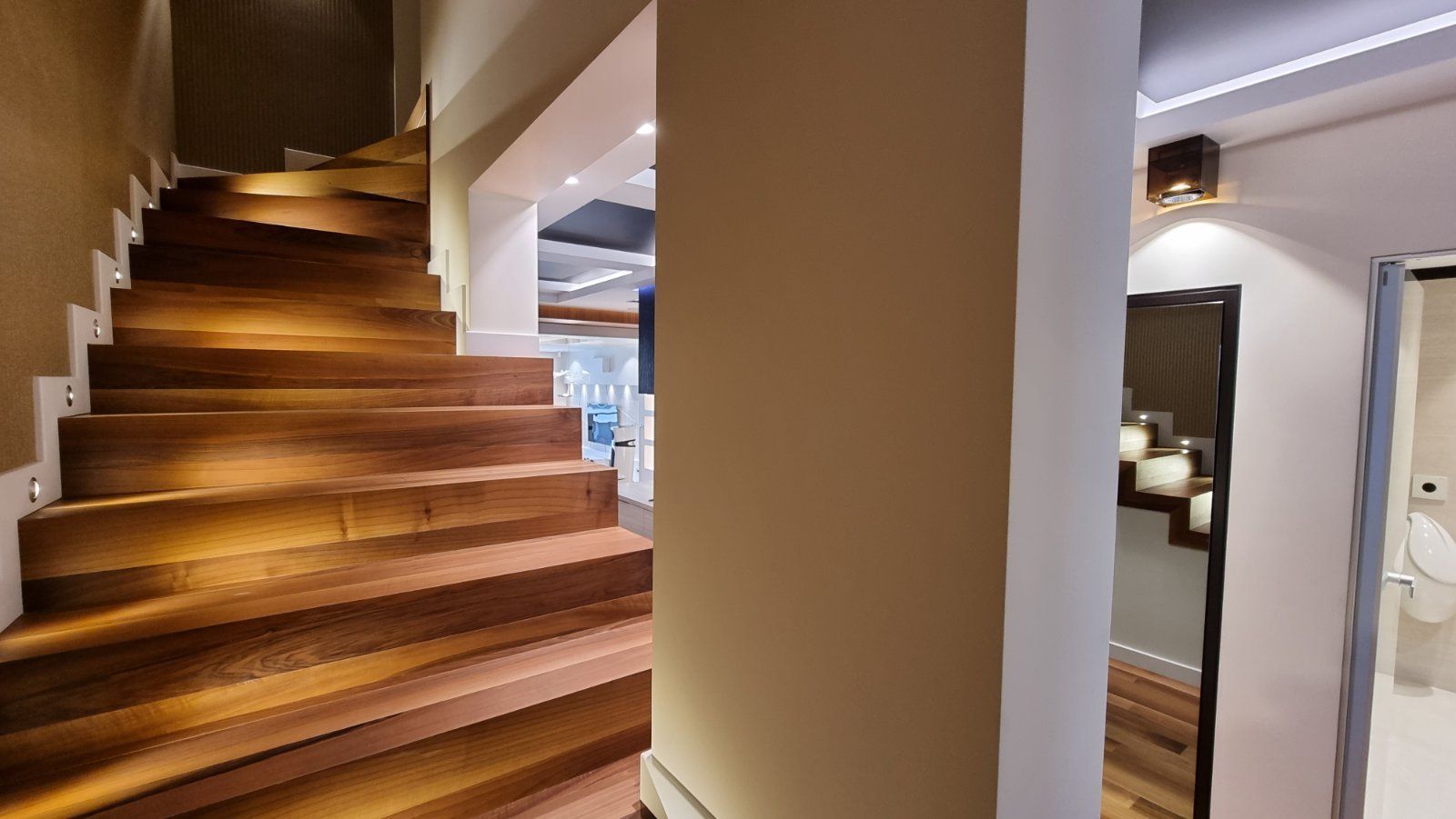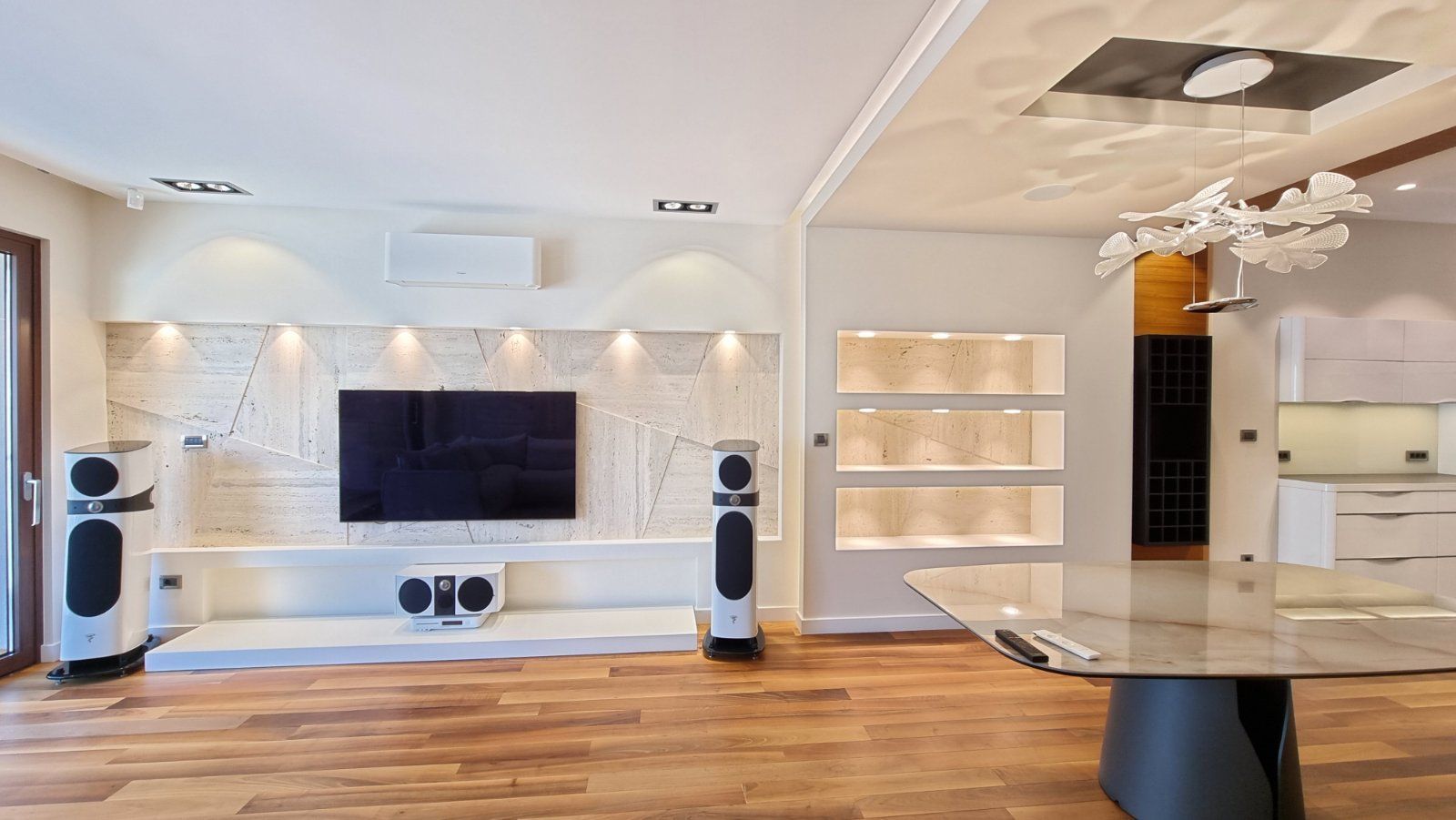 Prvi nivo čini prostrani dnevni boravak sa kaminom i trpezarijom, savršeno osmišljen za opuštanje i prijem gostiju. Iz ovog prostora stepenicama, ali i privatnim liftom, može se pristupiti višim nivoima stana.
