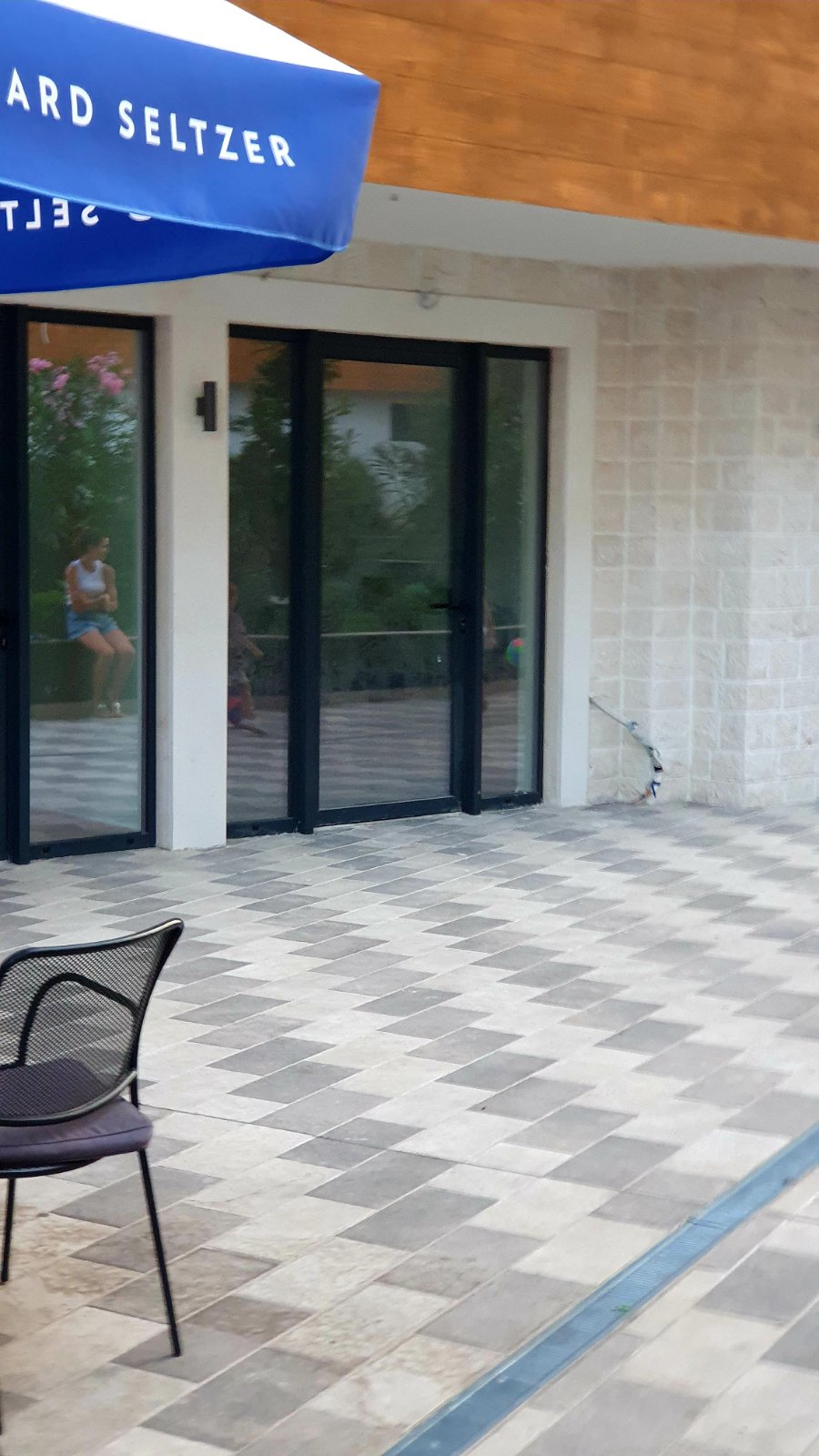 Ulazna vrata lokala su velika i staklena, pored kojih se nalaze i stakleni prozori.