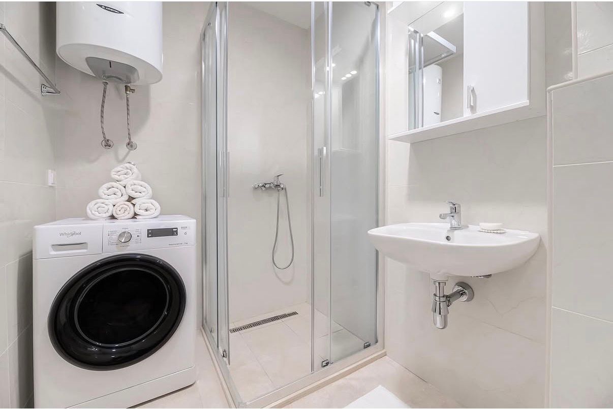 The apartment is located in close proximity to all necessary amenities such as a supermarket, bakery, pharmacy, restaurants, a bus station and a health center, making it extremely convenient for everyday life.